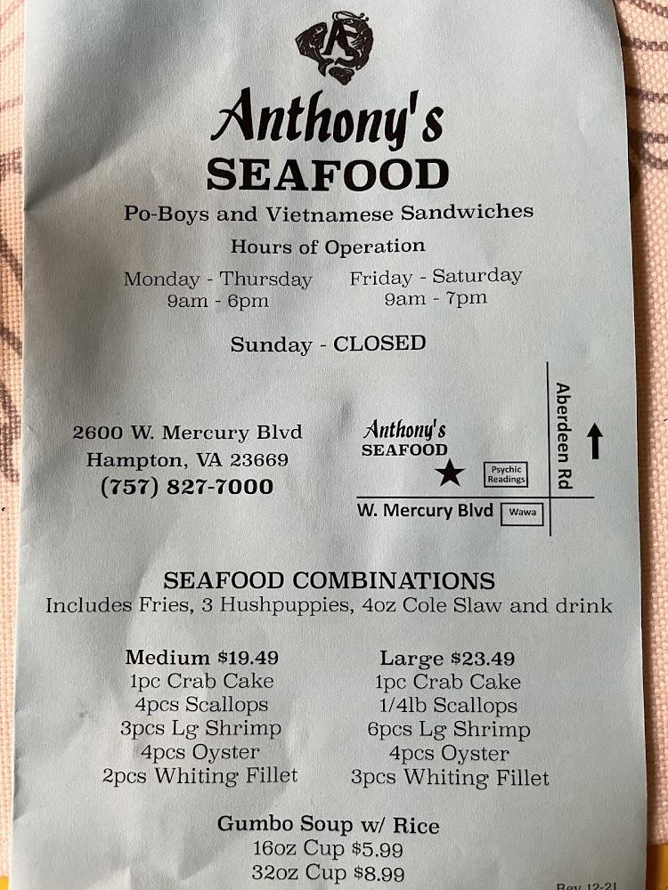 Situated in Hampton, Virginia, Anthony's Seafood stands out as a beloved quick-serve eatery in the area. This accessible seafood spot prides itself on quality and affordability, emphasizing fresh ingredients and generous portions. Locals appreciate the welcoming atmosphere, making it a great spot for families and friends to gather. A community favorite, Anthony’s offers a consistently delightful experience, whether it’s a solo lunch or a family dinner.